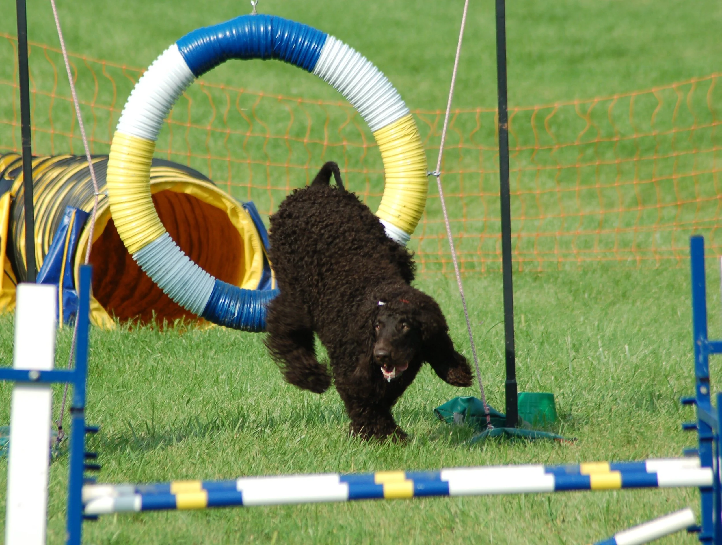 Agility and Irish Water Spaniels are a wonderful natural combination. Agility is an obstacle course that includes a combination of teeter-totters, tunnels, weave poles, tables and lots of jumping. It is truly a collaboration sport that combines communication, training and skill. A great way to focus energy, challenge the mind and improve co-ordination for both members of the team.